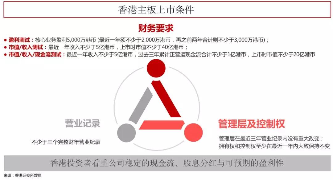 先来看硬指标,香港上市的财务测试较A股灵活,财务要求可三选一。
