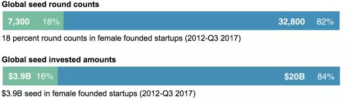 从种子轮总融资额上看,从2012年到2017年第三季度,全球共计39亿美元的投资投向了至少拥有一位女性创始人的公司,占全部种子基金投资额(200亿美元)的16%,分布于7300次投资之中。