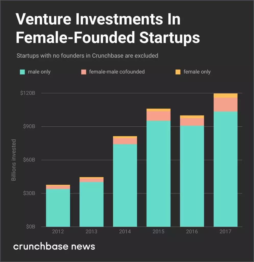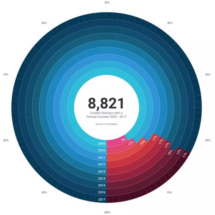 Crunchbase率先统计了女性创始人在创投圈的整体占比。发现在2009-2017年期间,在全部获得投资的54702家公司中,有8821家公司至少有一位女性创始人,占比约16%。