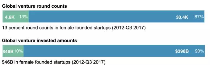 2012年到2017年第三季度,全球范围内仅有10%的风险资金投向了至少有一位女性创始人的公司,总额约为459亿美元,占全部风投资金的13%,分布在4600次投资中。