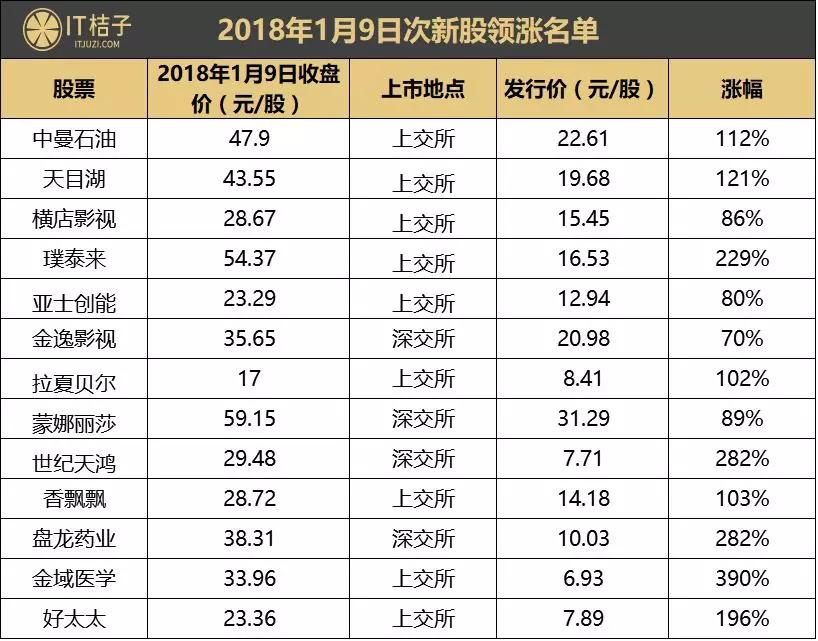 截止 2018 年 1 月 9 日,次新股板领涨榜上共有 13 家 2017 年境内上市企业,其中在上交所上市的有 9 家,在深交所上市的有 4 家。金逸影视涨幅最小,上涨 70%,金域医学涨幅最高,上涨 390%,平均涨幅超过 173%。具体来看,除了金域医学,盘龙药业作为医药板块的龙头企业在 2017 年涨势较大,医药板块整体都有明显涨幅,特别是涉及中药材、基因检测概念的企业。上交所上市的好太太现价 23.36,比发行价 7.89 上涨 196%。基于我国消费升级,智能化将开辟新空间的大好形势,智能家居市场未来仍将继续走好,以好太太,蒙娜丽莎为代表的传统家居转型升级企业今后走势应该也不会太差。