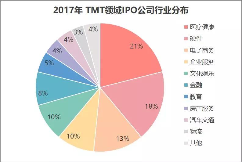 从 2017 年 TMT 上市公司的行业分布来看,主要集中在医疗健康、硬件、电子商务、企业服务、文化娱乐行业。其中,医疗健康行业 2017 年上市公司数量达 20 家,排名第一;硬件行业 17 家位居第二。