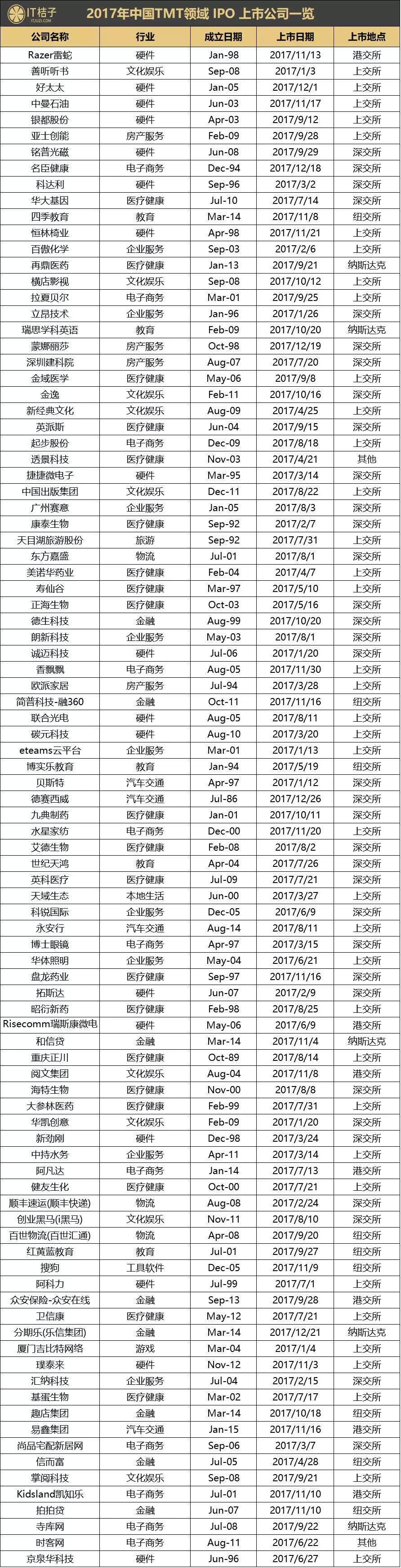 声明:2017 年 TMT 领域 IPO 公司没有包含新三板上市公司,其他如有遗漏,欢迎各位留言补充。复制、转载请注明数据来源:IT 桔子(ID:itjuzi521)。