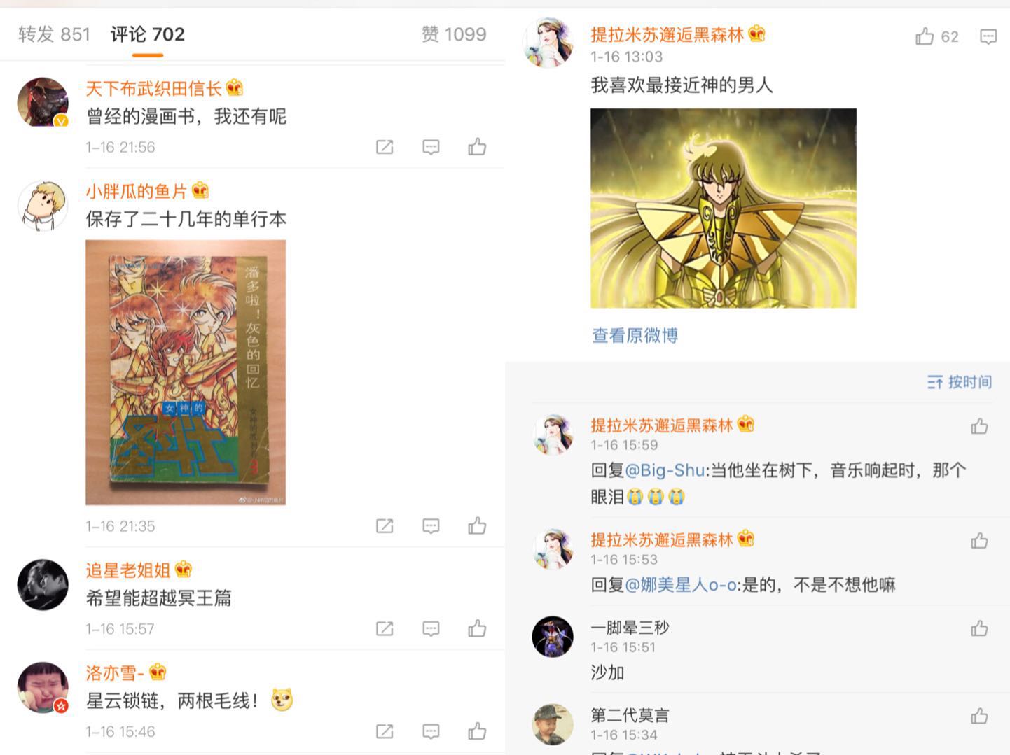 观众们被动画片中的热血与牺牲触动,直到今日仍有不少人存在《圣斗士》情结。翻拍消息一出,铁杆粉丝们还是相当激动,表示期待。有些粉丝还在微博晒出了保存了二十几年的单行本;还有人花痴地表示,沙加是她这辈子见到的最接近神的男人。