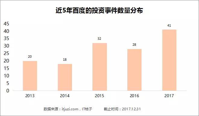 而到了 2017 年,百度的投资活跃度进一步上升。投资事件数量达到了近 5 年的最高位。