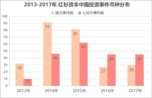 从红杉资本中国近 5 年的投资事件币种分布来看,2013、2014、2015 年美元基金仍然占据主导地位,这也与风险投资在最初几年还是一个从美国引进的新生事物有关。在中国股权投资市场中,过去很长一段时间都是由美元基金所「统治」,美元基金一股独大。但是这样的局面随着国内资本市场的蓬勃发展而迅速转变,人民币基金的规模不断壮大,逐渐占据了舞台的核心位置。而红杉资本中国也从一家以美元基金为主导的 VC 机构,转向为一家人民币基金投资更活跃的机构。