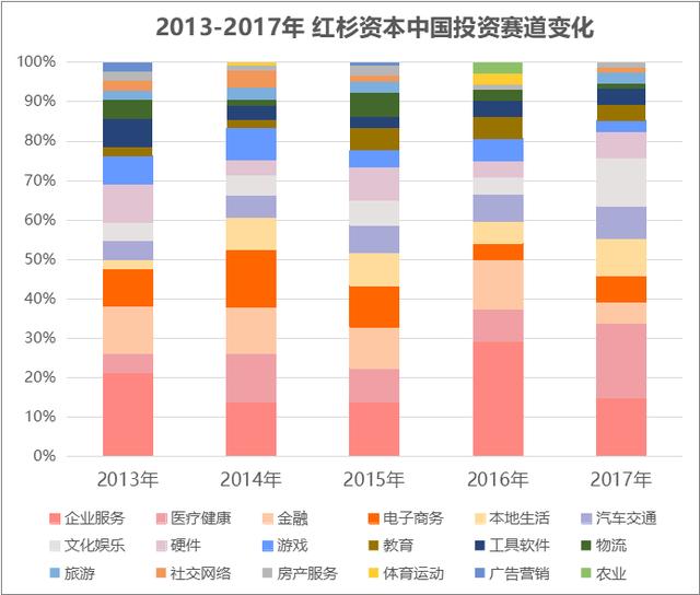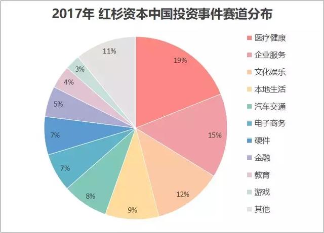 从 2017 年红杉资本中国的投资事件赛道分布状况来看,医疗健康、企业服务和文化娱乐成为红杉资本最热衷的三个投资赛道。这符合红杉资本中国在过去十几年关注的两大机会,一方面是由技术创新带来的各种机会;另一方面是由需求拉动的各种机会。医疗健康和文化娱乐显然属于需求拉动的投资机会,而企业服务领域的投资案例基本上都属于大数据、云计算、人工智能等以技术驱动为主的公司。