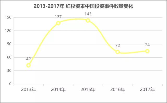 截至 2017 年 12 月 31 日,IT 桔子(ID:itjuzi521)追踪到红杉资本中国的投资事件数量接近 600 起。从最近 5 年的投资趋势来看,2015 年是红杉资本中国投资活跃度最高的一年,共出手了 143 次,其次是 2014 年出手了 137 次。2016 年受到资本寒冬的影响,红杉资本中国的投资策略开始变得更谨慎,投资事件数量仅为 2015 年的一半。2017 年虽然有所回升,但相比 2014 年和 2015 年的投资活跃度,仍有较大差距。