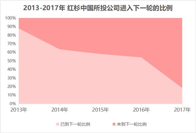 从近 5 年红杉资本中国所投公司进入下一轮的比例来看,2013 年投资的公司已经有 87.8% 走到了下一轮,2014 年为 63.42%,2015 年为 57.92%,2016 年为 53.95%,刚刚过去的 2017 年所投资公司进入下一轮的比例就达到了 18.18%。近 5 年所投公司进入下一轮的平均值为 56.25%,即超过一半的项目都能走到下一轮。可见,红杉资本中国所投公司绝大部分都能进入下一轮,毕竟名声在外,愿意接红杉「盘子」的机构会有很多。