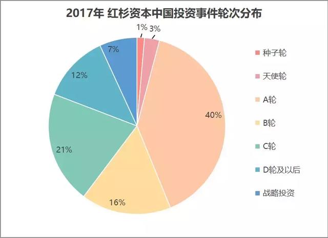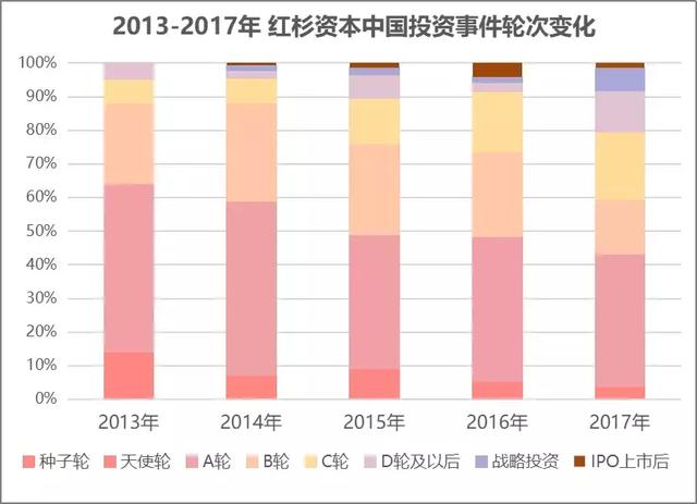 根据 IT 桔子(ID:itjuzi521)的数据显示,红杉资本中国在 2017 年的投资事件中,早期投资(种子/天使轮、A 轮,下同)占比达 45%,成长期(B、C 轮,下同)的投资占比达到 36%,D 轮及以后的占比也达到了 12%。虽然 A 轮投资占比仍然最大,但是成长期和成熟期(D 轮及以后)的投资事件占比甚至超过了一半。