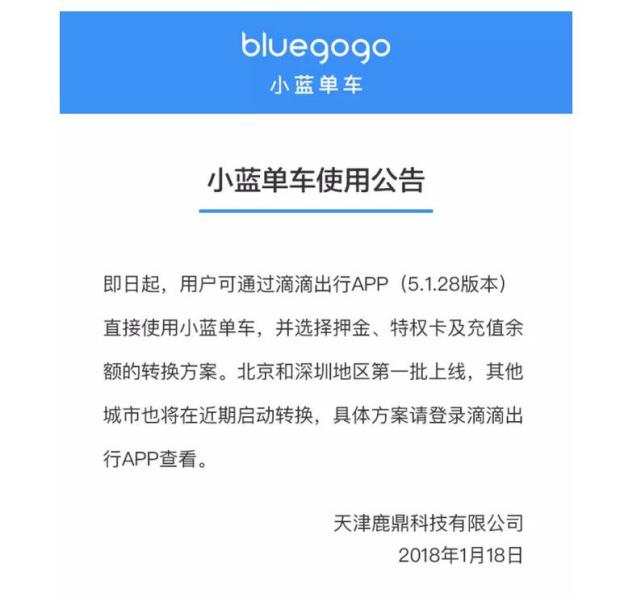 1月9日,小蓝单车发布致用户的一封信,宣布近期将托管给滴滴出行。根据托管安排,小蓝单车的品牌、押金和欠款等事务仍归属于小蓝,滴滴并无退还小蓝单车押金、特权卡、充值余额的义务。