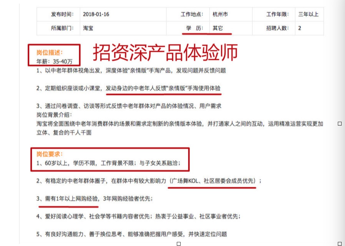 前两天,淘宝发布了一则“35万-40万高额年薪招聘老年产品体验师”的求贤令,刷爆了大家的朋友圈。网友们纷纷爆笑回复表示,“原来我爸妈这么值钱”,“原来我也能有成为富二代的一天”,“望父成龙机会到了”,“我爸不是广场舞kol,但他是麻将kol,淘宝你要不要”。