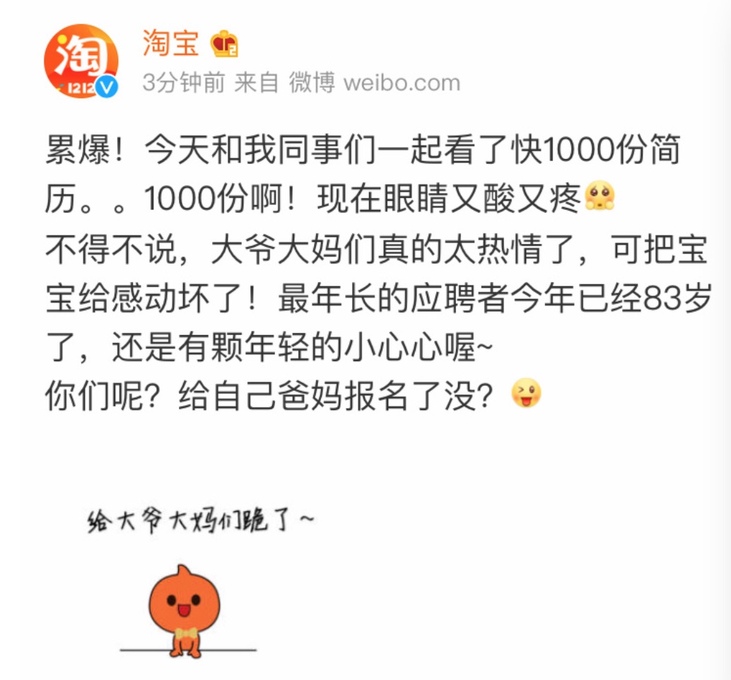 针对这场意外走红的这场招聘,淘宝表示,“目前工作人员正在加班加点筛选简历,并将很快安排候选人参加线下沟通会,也会邀请淘宝产品经理跟老年候选人们进行深度沟通”。