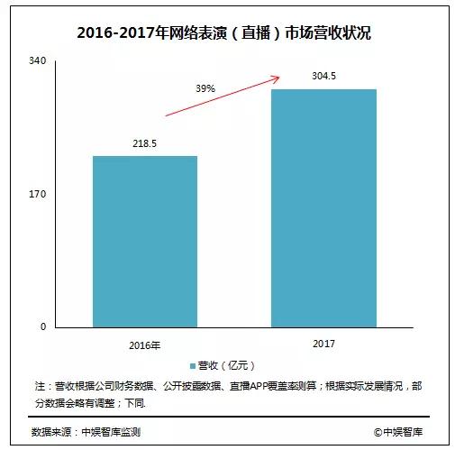 2017年我国网络表演(直播)市场营收达到304.5亿元,相比2016年的218.5亿元,同比增长39%。网络表演(直播)已经成为网络文化内容供应、技术创新、商业模式创新的代表,成为网络文化市场重要组成部分。