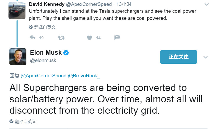 实现了所有工厂的100%可再生能源驱动,但这还远不够。特斯拉公司使命「加速世界向可持续能源的转变」不是那么好抗的。2017年6月10日,一位网友在Twitter上@Elon Musk:“不好意思,在特斯拉超级充电站身上我看到了火力发电厂的影子,所有你玩的这些概念游戏背后(动力来源)都是由燃煤驱动的。”
