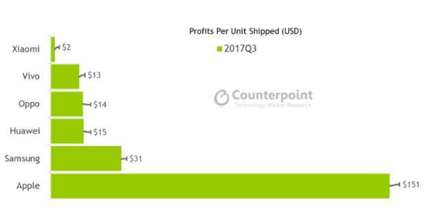 根据市场研究机构Counterpoint Research发布的报告显示,2017年整个第三季度,全球六大智能手机厂商中,苹果的单机利润高达151美元,三星也有约31美元,而国产手机厂商单机利润最好的华为仅有15美元,小米的单机利润更是低至2美元。