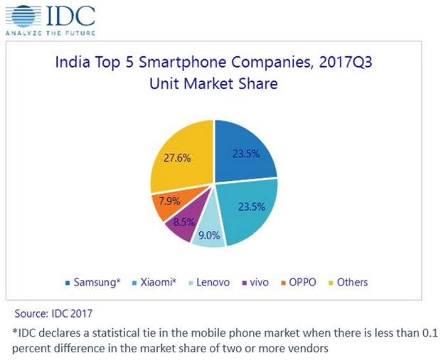 除了小米之外,联想、OPPO、vivo甚至一加等国产手机品牌,也在印度市场呈现出相当不错的销售景象。根据IDC公布的印度市场2017年Q3手机销量排行榜,印度手机市场除了与小米并列第一的三星之外,其他排名靠前的3位也均为中国手机品牌,分别是第三至第五位的联想、OPPO、vivo。