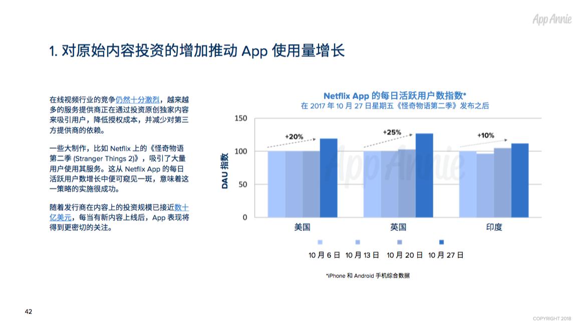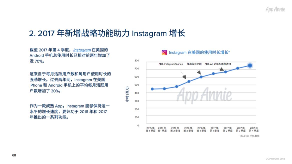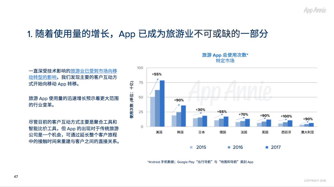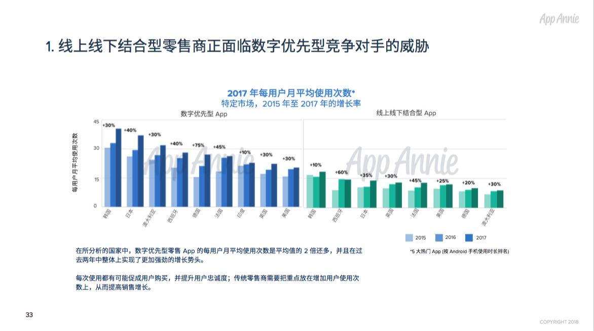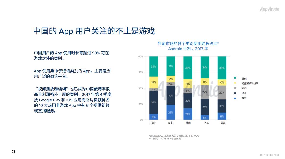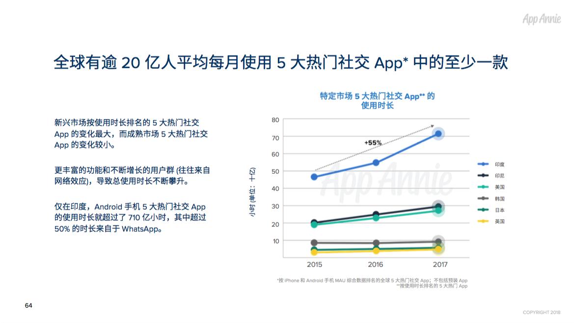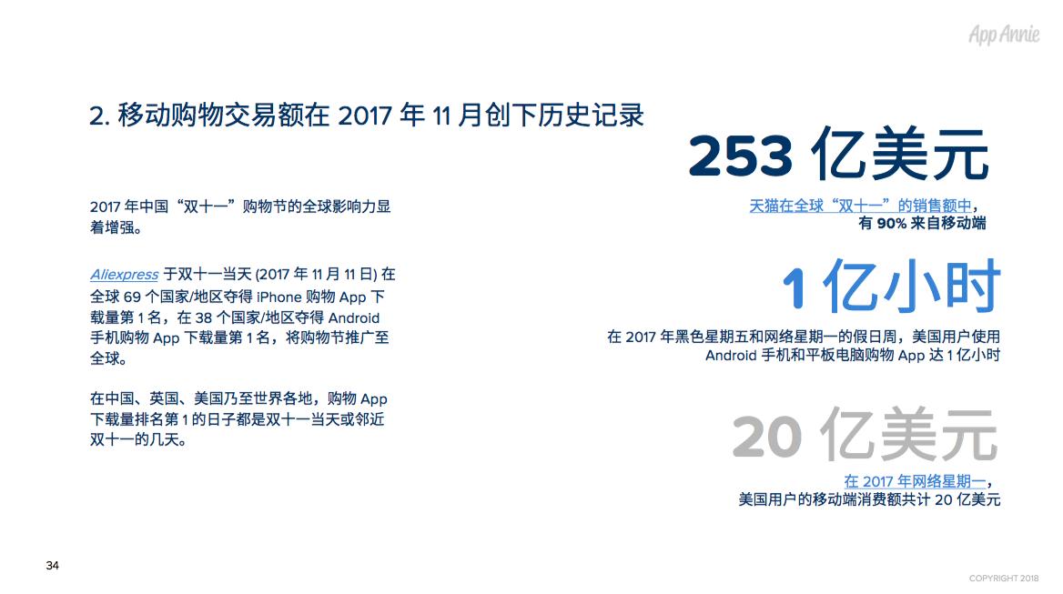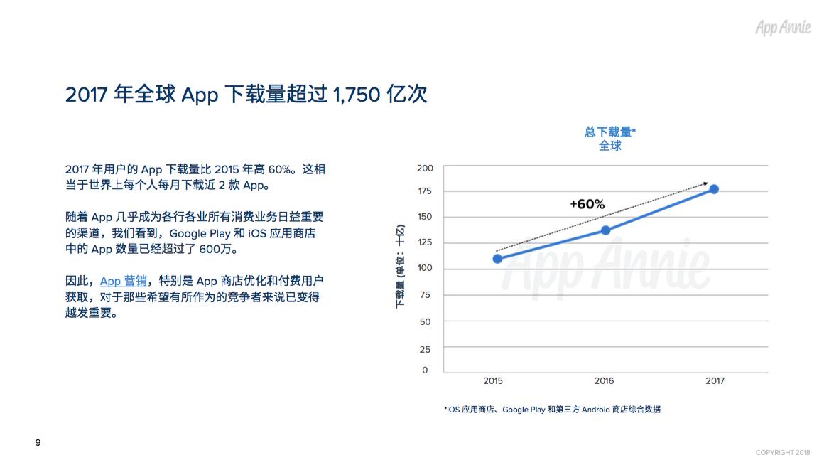 整体上,2017年这一年,全球 App 下载量增长了 60%,消费额增长了 1 倍多,App 使用时长激增了 30%,每名用户每年的 App 使用时长达到了约 43 天。