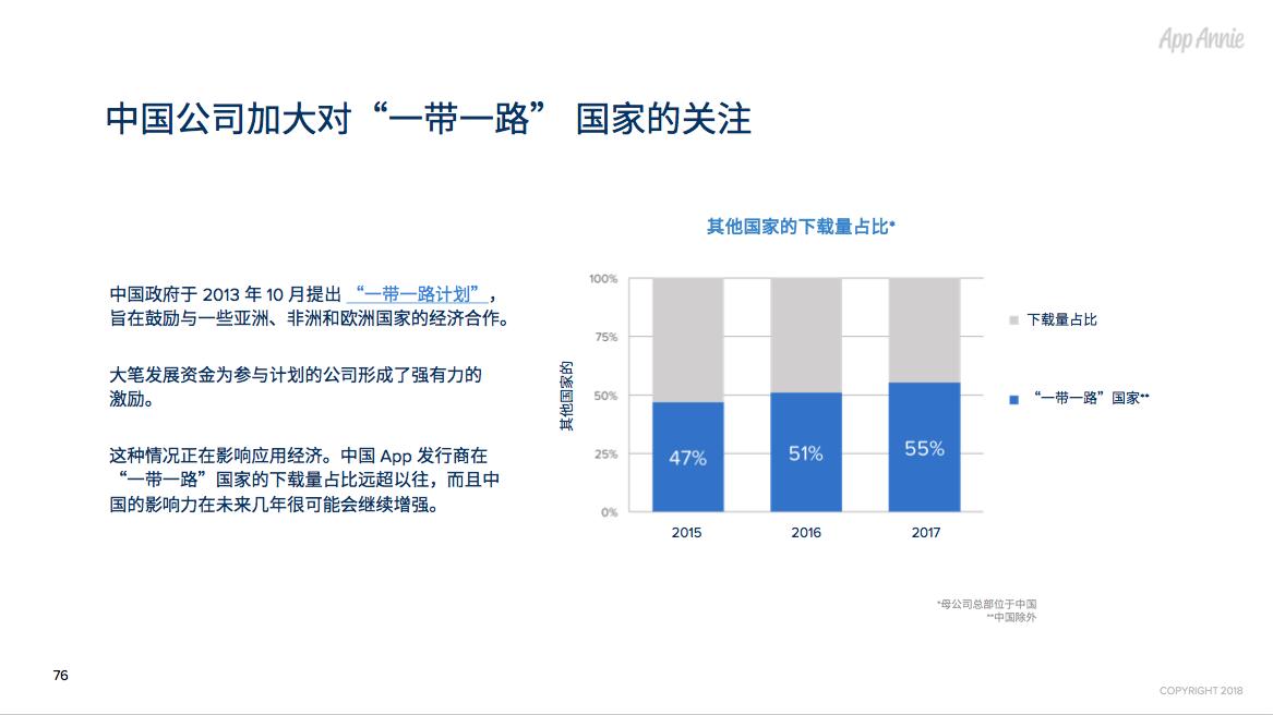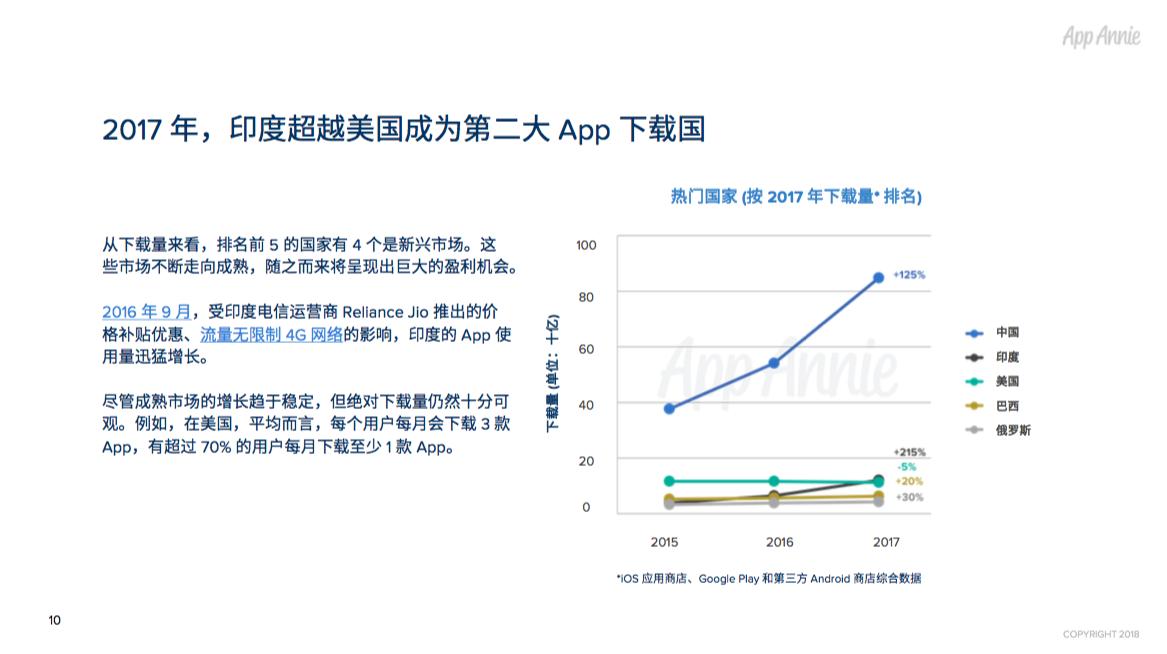 无论从哪一方面来衡量,中国 App 市场都远胜过其他国家/地区。2017 年第 4 季度,中国 App 用户 iOS、Google Play 及第三方 Android App 的使用时长达到 2000 亿小时 (将位居第二的印度远远甩在后面,其同一时段内的用户 App 使用时长仅为 500 亿小时)。此外,全球 App 商店、App 内广告和移动商务带来的消费额中,有 1/4 由中国市场创造。