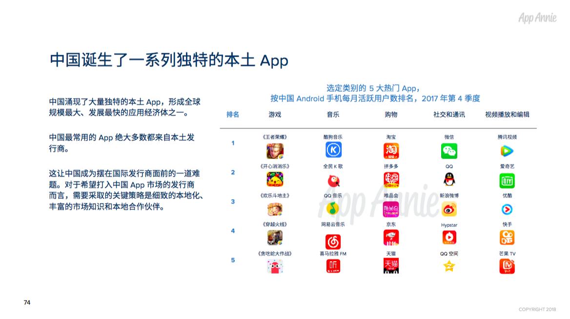 中国最常用的 App 中,大多数由中国公司发行,其中一些正在进军全球市场。举例来说,大获成功的共享单车 App 摩拜单车和 ofo 在全球迅速扩张,由此可以预见,未来几年全球将出现一种全新且利润丰厚的共享经济形式。