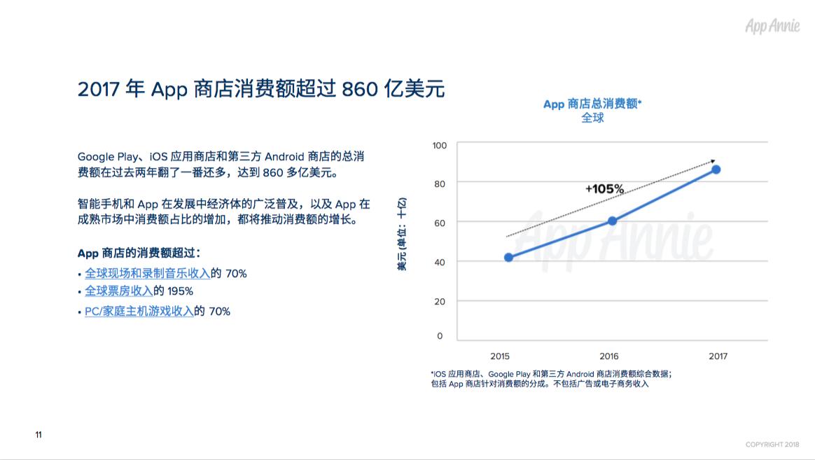2017年App商店消费额超过860亿美元,超过全球票房收入的 195%