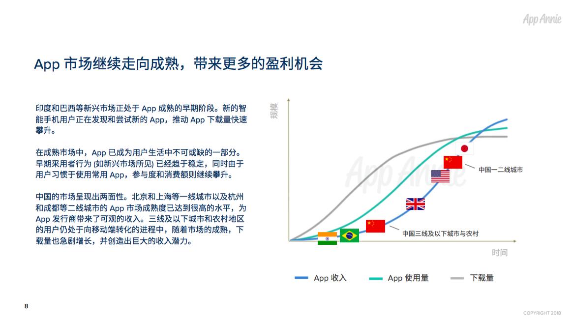 印度和巴西等新兴市场正处于 App 成熟的早期阶段。在成熟市场中,App 已成为用户生活中不可或缺的一部分。中国市场则呈现出两面性。北京和上海等一线城市以及杭州 和成都等二线城市的 App 市场成熟度已达到很高的水平,为App 发行商带来了可观的收入。三线及以下城市和农村地区 的用户仍处于向移动端转化的进程中,随着市场的成熟,下 载量也急剧增长,并创造出巨大的收入潜力。