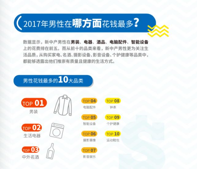 数据显示,新中产男性在男装、电器、酒品、电脑配件、智能设备上的花费排在前五。从排在前十的几大品类上看,可以看出生活品质,是新中产男性消费上的核心追求。从年龄上看,90后爱形象,80后爱家庭,70后爱名酒。