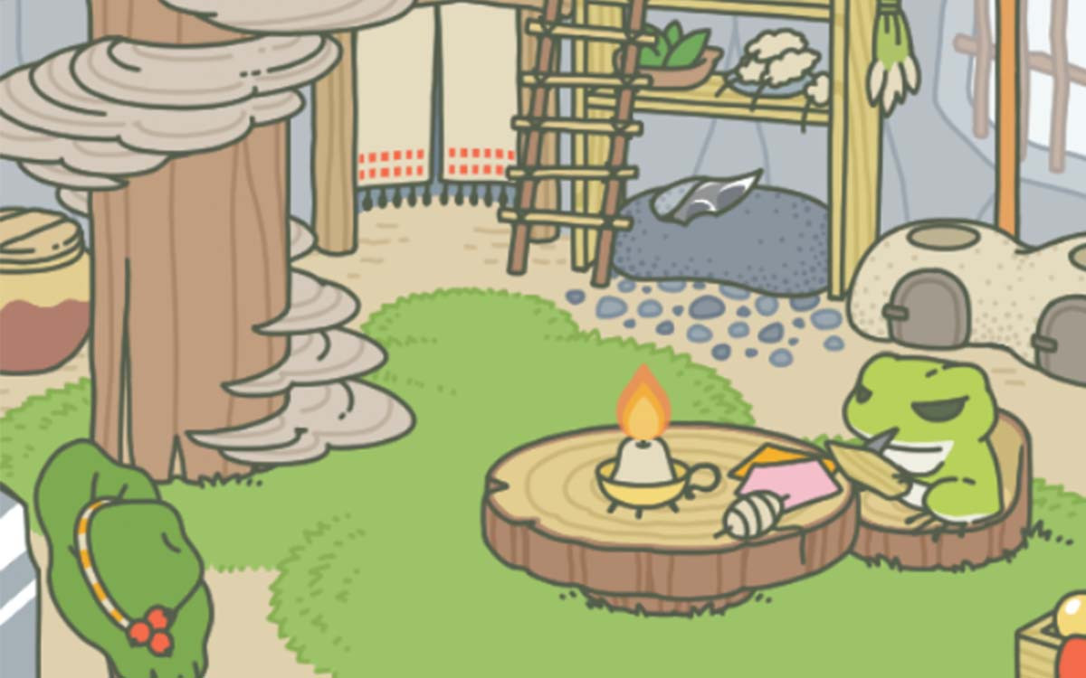 界面的右下角有一个像房子的按钮,点击它,我们就进入了游戏的另一个界面——蛙蛙生活的房间。这是一个小户型 loft 公寓。底层是蛙蛙的起居室,一桌一椅一柜,可以说是非常简单了,因此也有人说这只蛙蛙过的是「修道」的生活。