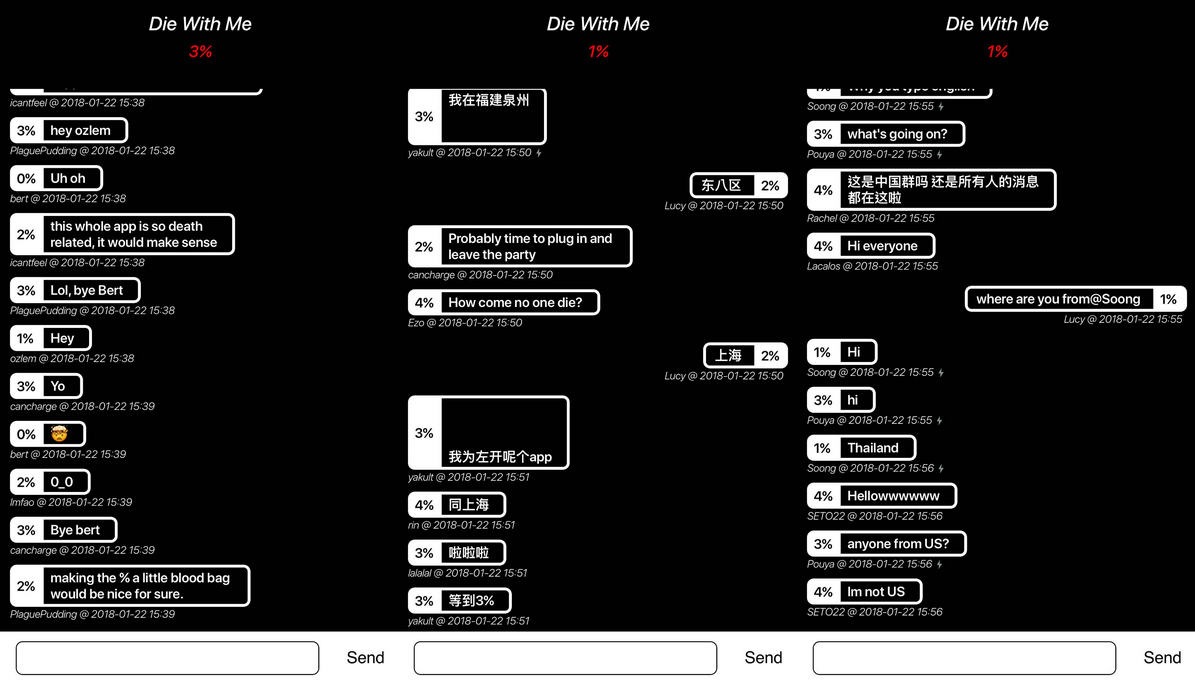 当前版本的Die With Me只是一个简单的、匿名的聊天游戏APP,不过创始人想要把它变成一个约会应用程序,挖掘它在两性社交方面的潜力。