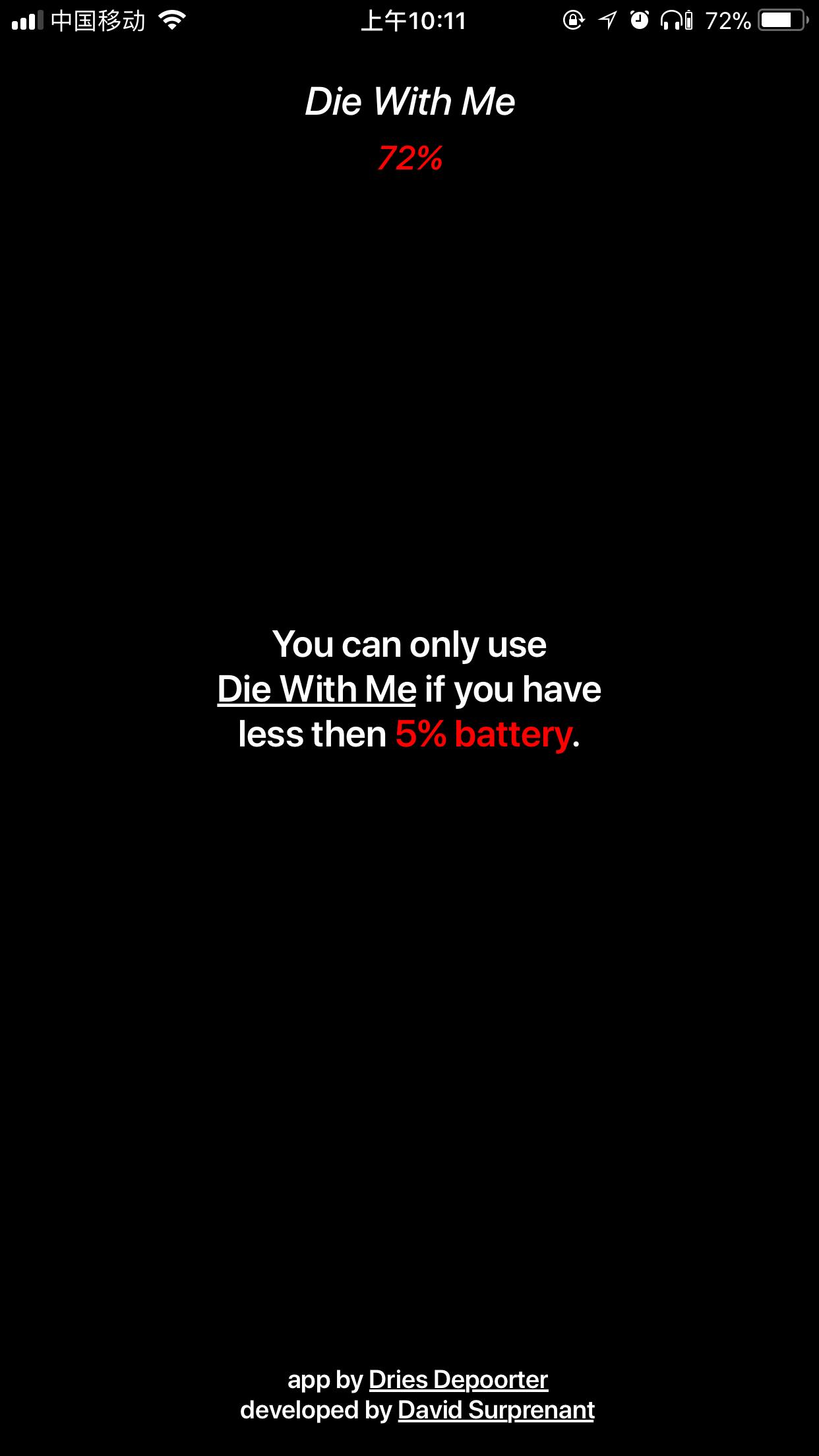 因为这款叫做Die With Me的聊天应用有一个使用条件,手机电量只要超过5%,你就没办法打开它。