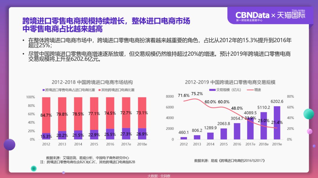 在整体跨境进口电商市场中,跨境电商的占比从2012年仅有的15.3%到2017年已超过27%,2018年预计可以达到近3成比重。交易规模从460.1亿元上升到4089.5亿元,预计2019年跨境进口电商规模将上升至6202.6亿元。