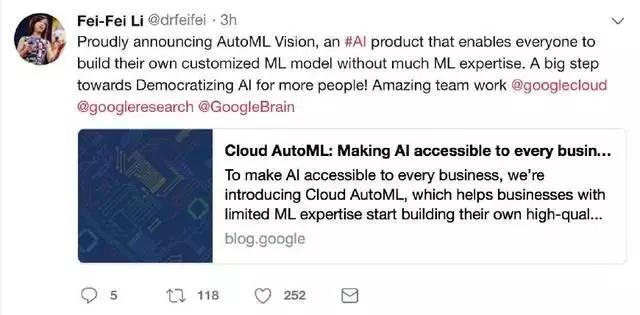 坊间流传着这么一个说法:谷歌想回中国,必须靠AI;而靠AI回中国,必须搞个大事情。于是,上周四的晚上李飞飞发布了一篇博客,然后连着发了三条推特,宣布一个叫AutoML的AI产品启动了。