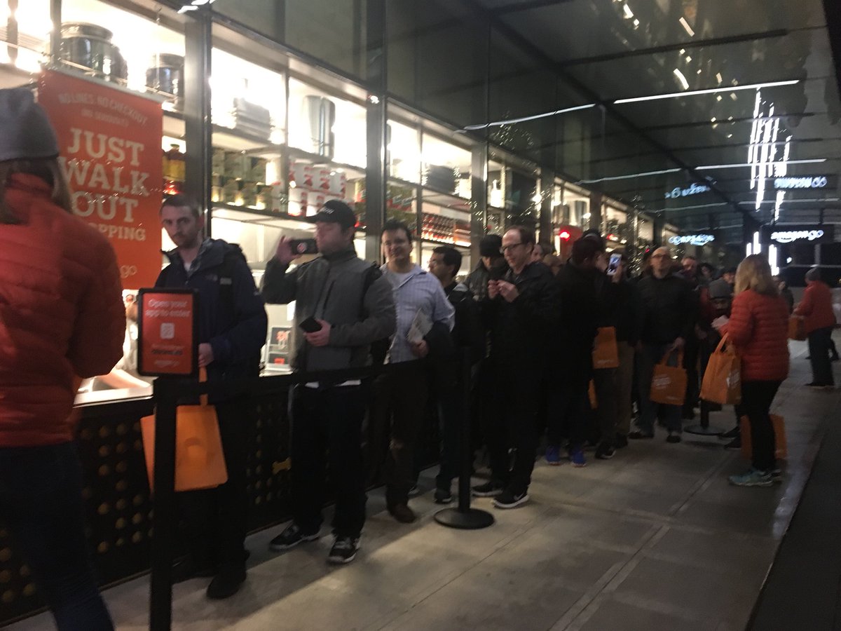 早上7点不到,Amazon Go门口就排满了好奇的消费者与媒体朋友们,网友们纷纷在Twitter上吐槽,“喂,亚马逊!说好的不用排队呢?”