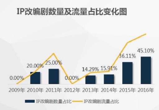 在2013年之后,IP概念改变了网络文学。以电视剧市场为例,2013年,全网总播放量位居前十的剧集中,网络文学资源改编的作品有两部入围,而到2015年,由热门网络文学资源改编作品已经占据全网、电视剧播放量前十排名的一半。