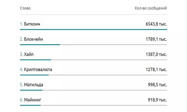 “Биткоин”(比特币)已经爬上了山顶俄罗斯社交媒体最受欢迎的词之一。据Medialogia统计数据显示,在6,543,800个帖子中都提到了这一点。“Блокчейн”(区块链)是第二,在180万年接近180万的帖子。俄罗斯对加密货币、矿业和以太的词汇也进入了前10名,而ICO是第11名。
