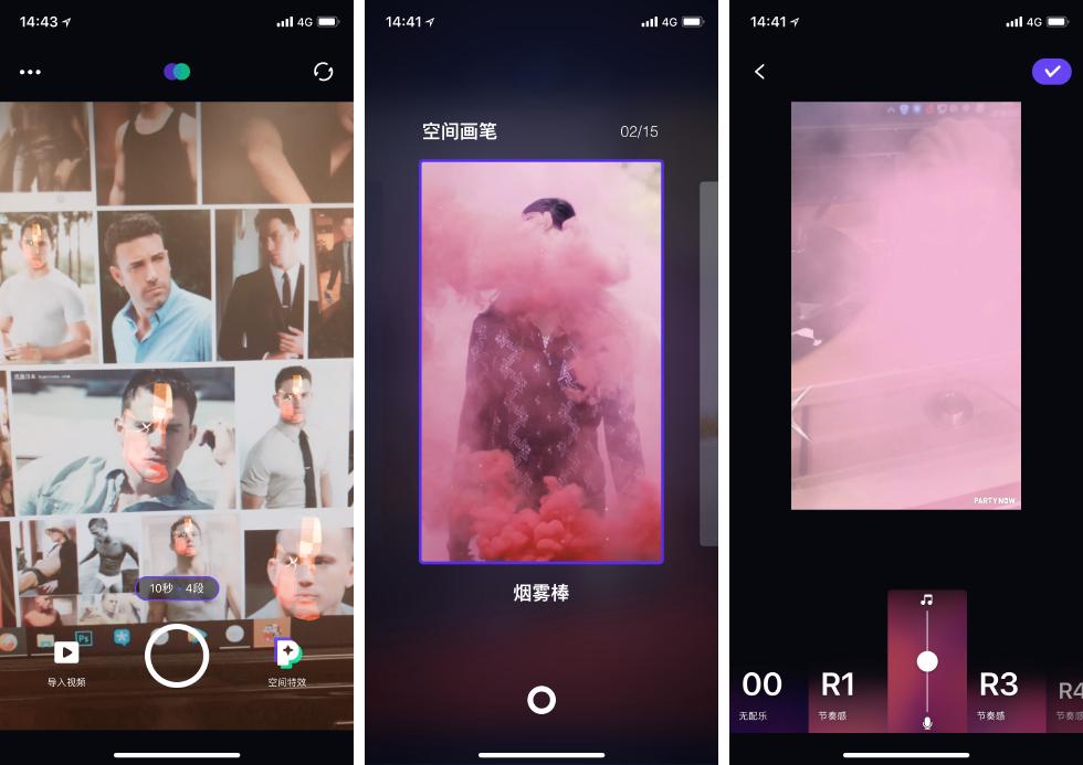 PartyNow 提供了 4 种空间画笔和 10 种空间氛围,点击「空间画笔」你便可以自由在拍摄空间中作画,借助于 ARKit 画笔可以实现景深效果,无论是镜头推进还是人物移动,特效都能与画面很好地融合在一起。「空间氛围」则会对拍摄对象的面部进行识别,然后自动设计一系列有趣的动画。