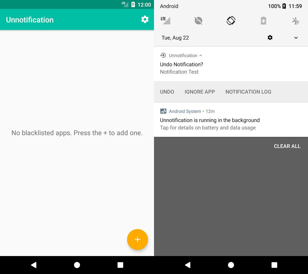除了「后悔药」,Unnotification 还额外提供了「忽略应用(Ignore App)」和「通知日志(Notification Log)」选项,前者可以将该应用收入 Unnotification 的黑名单防止频繁干扰,后者可以直接跳转至 Android 系统 隐藏的通知日志 界面。