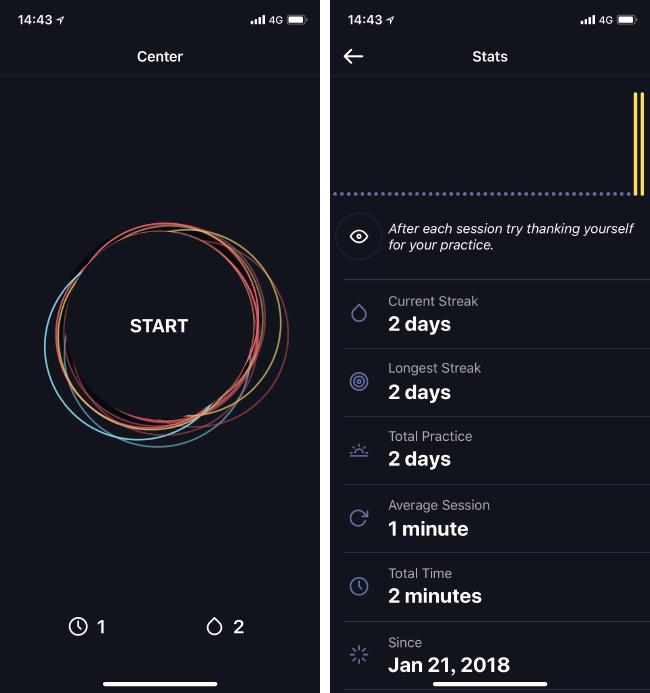 Center 的 UI 非常简洁,环绕着彩色条纹的 Start 按钮占据了屏幕的大半部分,点击开始,一声钟响之后没有鸟语蝉鸣,也没有流水风啸,Center 只是安安静静地陪着你,直到钟声再次敲响,冥想便随之结束了。Center 提供从 1 分钟到 1 小时共 10 档冥想时长,你可以点击左下角的时钟按钮调节,此外你还可以在此更改间隔声音、每日提醒等。每当你完成一次冥想,应用便会记录下来,点击右下角的水滴按钮,你可以查看自己的冥想历史。