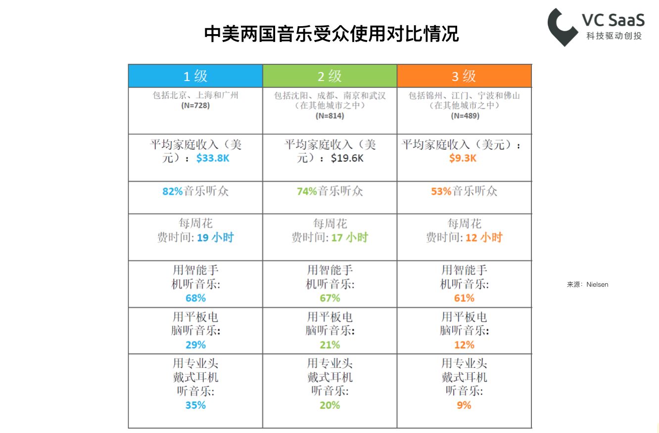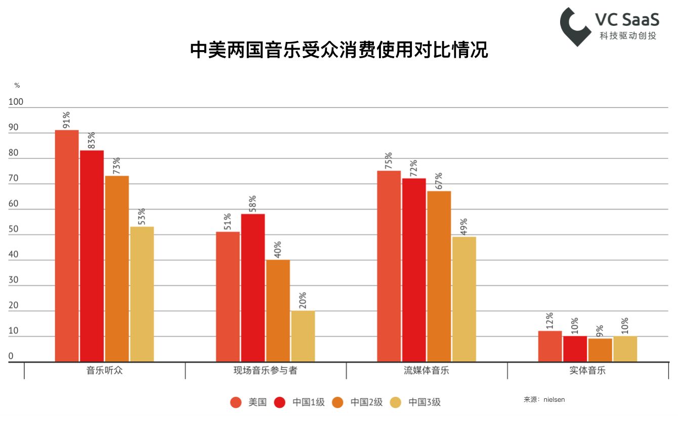国际资讯机构Nielsen在2017年对中美两国的音乐受众作出了对比,并将中国音乐受众分3级进行解析。