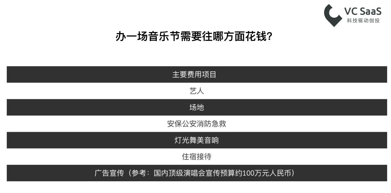 在音乐节举办方面,城市差异十分之大。一般举办规模为2-3天,总计3万人入场,票价均价为100元的一场音乐节,在国内北上深广等一线城市的成本预算为800-1000万元人民币。而在国内二三线城市举办同级别规模的音乐节,成本区间则在200-350万元人民币。