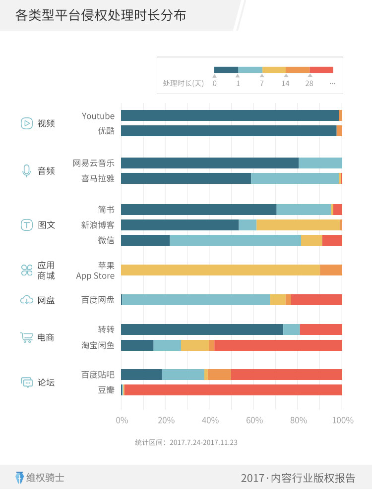 视频音频类平台由于自身产业发展时间较长,相对成熟,而且海外对版权价值以及版权保护的认知环境优于国内,因此我们看到面对版权侵权通知时处理的积极程度普遍高于其它类型的平台,比如国外的Youtube,国内的优酷等视频大站。