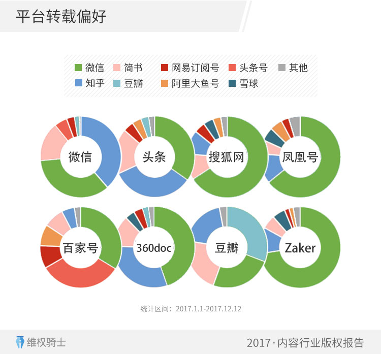 但版权保护联盟的成功,不能掩盖整个行业版权乱象:全年发生的80%的侵权事件分布在微信公众平台,但微信上侵权内容的清除率却不足20%;微信、知乎、简书作为原创作者集中栖息的平台收到非法转载的情况最严重;微信、豆瓣存在大量平台内部抄袭的乱象;垂直领域抄袭严重涉嫌不正当竞争。