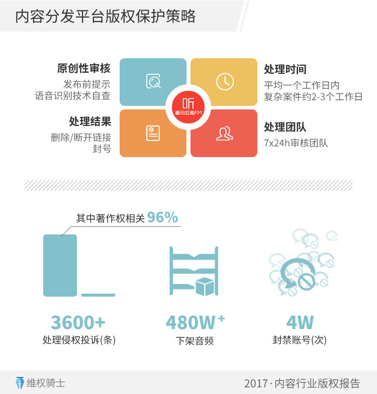 喜马拉雅作为知识付费内容分发平台典型代表,面对盗版内容也非常谨慎,防止盗版内容对内容分发平台造成不必要的法律风险。喜马拉雅在版权保护方面做的努力如下: