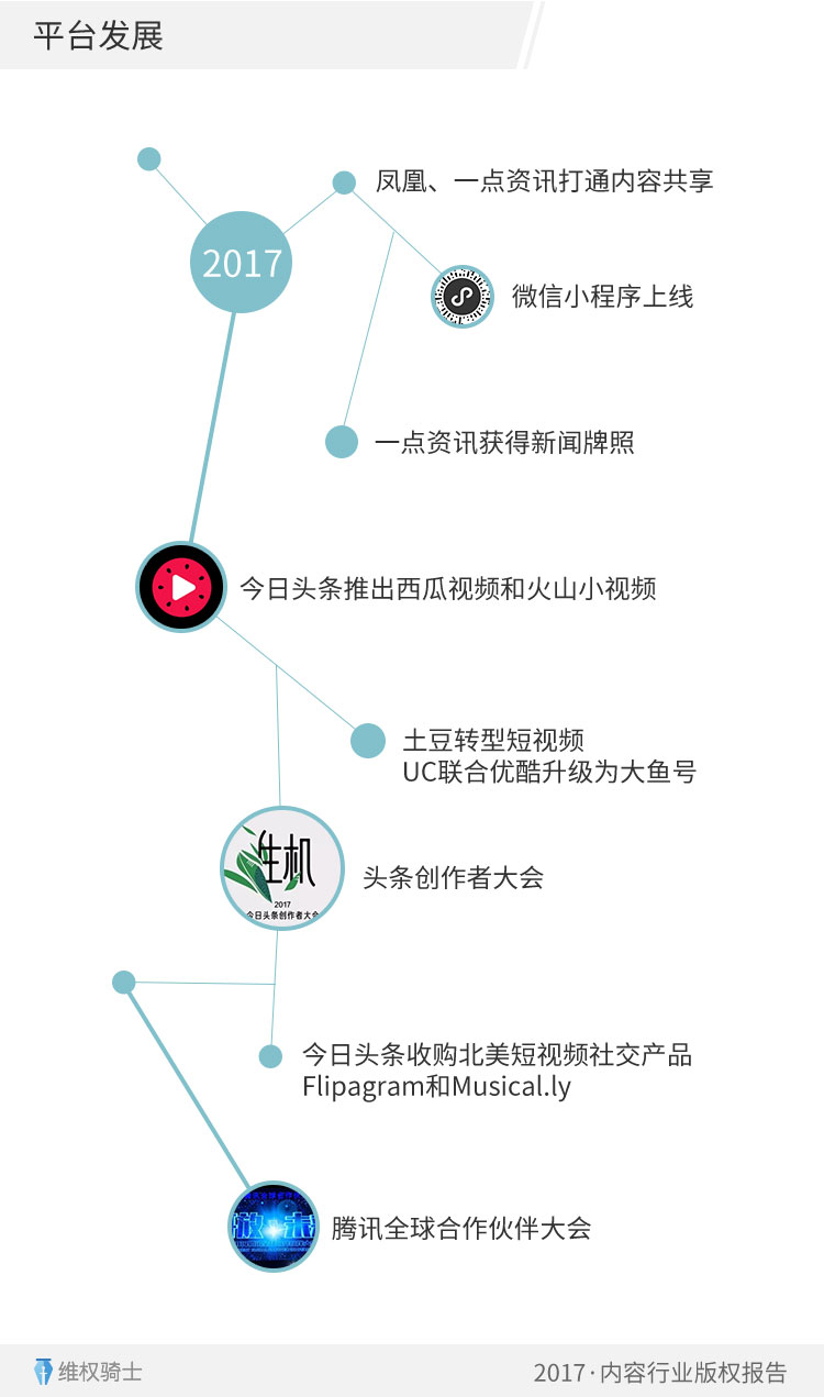 自媒体平台在经历短暂的喘息后继续探索变局,扶持、孵化优质内容成为获取核心竞争力的不二法门,短视频走到了风口。2月,凤凰网、一点资讯打通内容共享,与视觉中国、秒拍、小咖秀等业内领先平台达成战略合作,实现产品后台的全面打通。3月,UC头条联合优酷土豆正式升级大鱼号,土豆转型短视频平台,全面进军短视频;腾讯投资短视频平台快手。6月,百家号借大规模封号展露对原创内容的重视程度。今日头条先后收购北美短视频社交产品Flipagram和Musical.ly,抖音、西瓜视频、火山小视频相继出现在大众视野。年末,腾讯全球合作伙伴大会上,企鹅号推出全平台分发的内容开放战略;头条创作者大会上,头条号继“千人万元计划”后又推出“千人百万粉计划”。