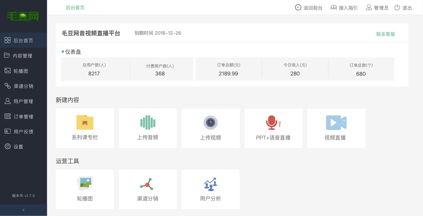 简单来讲,毛豆网技术支持在线课堂实时连续音视频、PPT全屏播放,用户双方可以聊天互动,直播可以自动生成字幕,结束后可自动回放。在后端毛豆网也会做内容管理、用户管理、订单管理、渠道分销等。