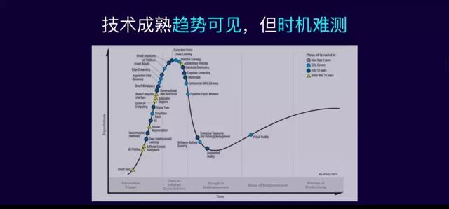 所以说技术的趋势是可以预见、可以判断的,但是我们处在这个曲线的哪个位置,是低谷还是光明期,坦白地说,不那么容易判断,甚至Gartner公司在预测技术的时候,有的时候会自己打脸。