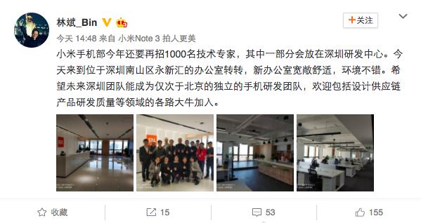 最前线 | 林斌现身小米深圳研发中心,今年要再招1000名技术专家