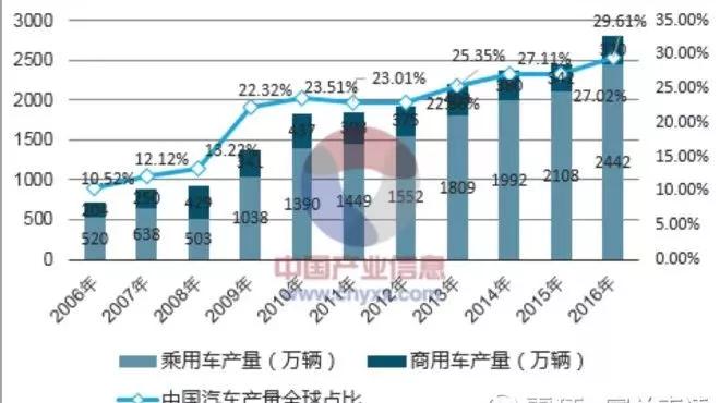 2006 年~2016 年中国汽车产量及占世界汽车总产量的比重