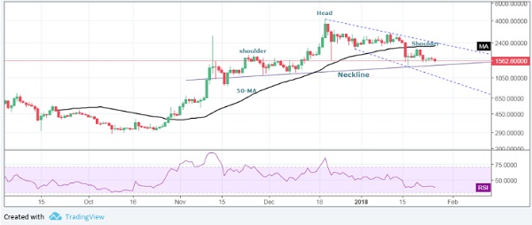 当然,相比于1月17日1343美元,比特币现金价格还是有所回升,而且在随后几天时间里都出现了连续买盘。不过,在1月20日攀升到2110美元之后,比特币现金价格又再次下跌,从以下分析图中可以看出看跌格局。
