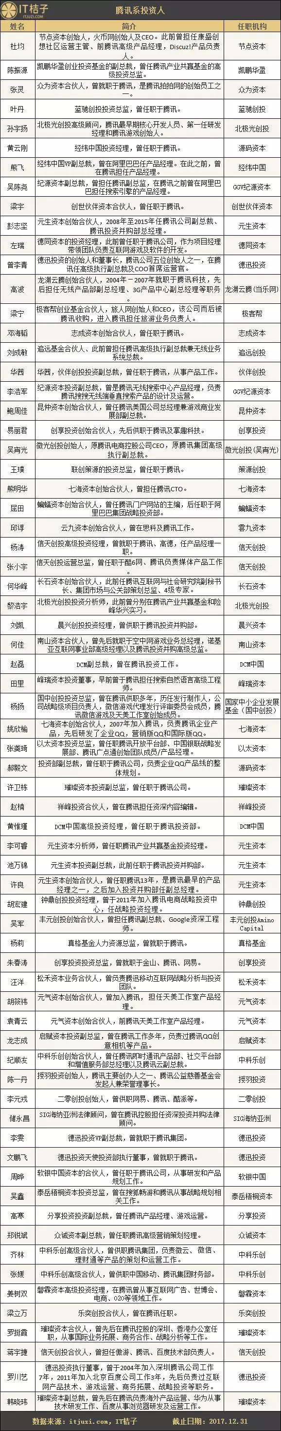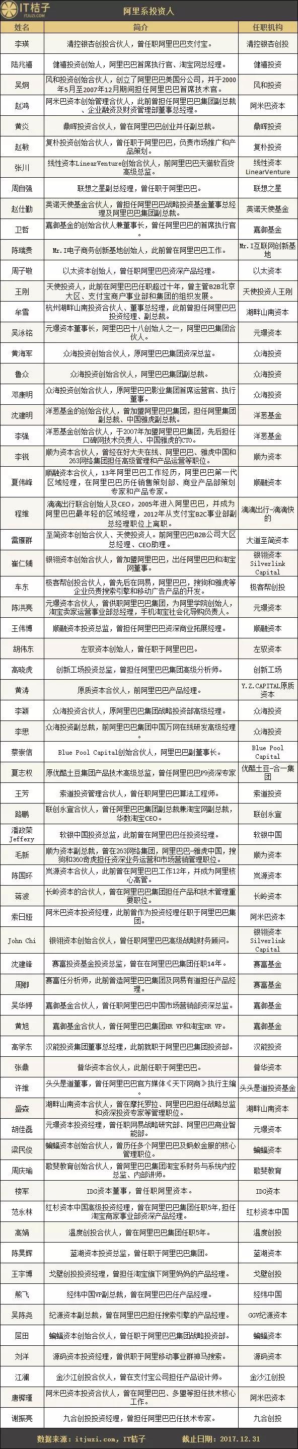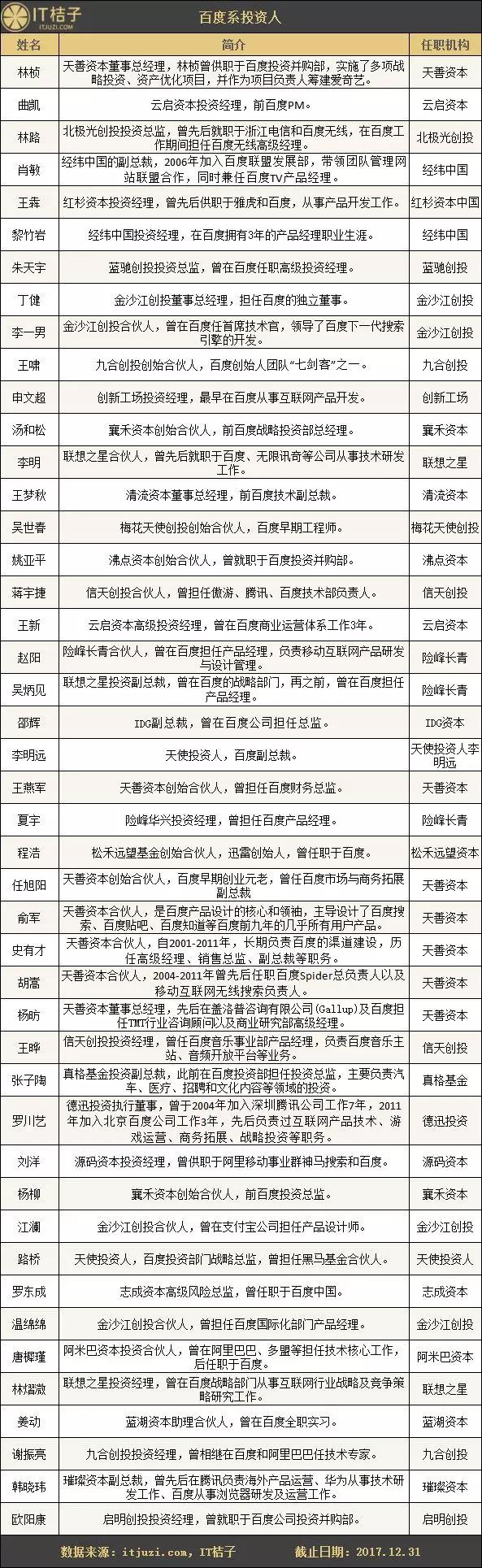 以下为 IT 桔子(ID:itjuzi521)收录的 BAT 背景的投资人:
